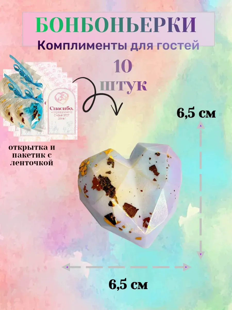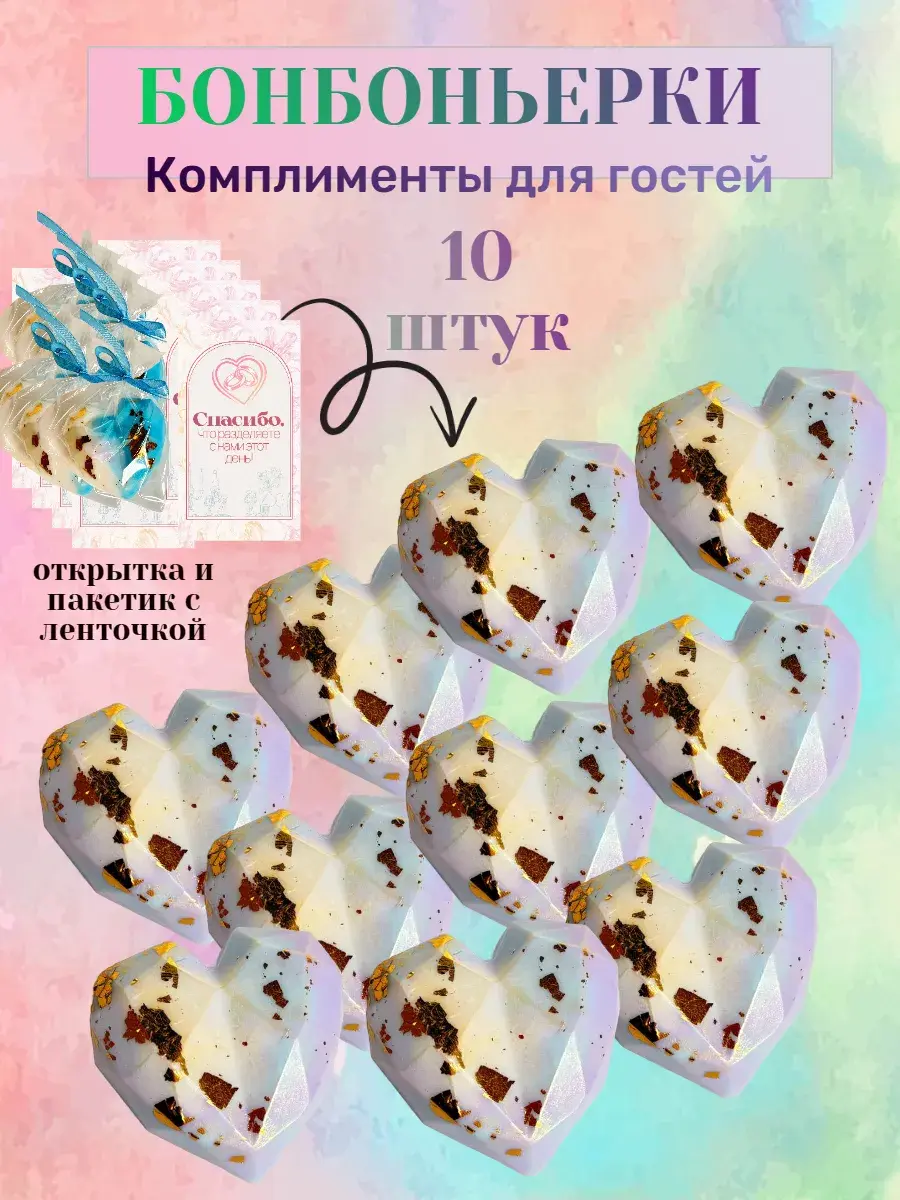 Изысканные свадебные бонбоньерки-сердечки из ароматического мыла ручной работы: нежные комплименты для ваших гостей! Создайте незабываемую атмосферу праздника Особые моменты требуют особенного подхода. Порадуйте гостей вашего торжества очаровательными бонбоньерками в форме сердечек и нежным мылом ручной работы – символом любви и благодарности! Что входит в набор: 10 индивидуальных упаковок нежных сердечек Стильные пакетики с декоративной лентой Изящные открытки с теплыми пожеланиями Авторская рецептура из натуральных ингредиентов Ароматическое мыло ручной работы в форме сердца с нежными цветочными ароматами Почему наши бонбоньерки особенные: Безупречное качество – используем только отборные ингредиенты Оригинальный дизайн – каждое сердечко украшено уникальной печатью Удобная упаковка – каждая бонбоньерка упакована отдельно с открыткой Натуральные компоненты Роскошное мыло с эфирными маслами розы, лаванды и жасмина Нежные ароматы, которые долго сохраняются Характеристики продукта: Бонбоньерки: Ароматическое мыло: Натуральные компоненты – мыльная основа с глицерином Эфирные масла розы, лаванды и жасмина, цитруса и ягод Размер: 6,5*6,5 см Вес одного мыла: 40 г Срок использования: 24 месяцев Идеальный выбор для: Свадебных торжеств Юбилейных мероприятий Корпоративных праздников Дней рождения Романтических событий Подарите гостям незабываемые впечатления и оставьте в их сердцах теплые воспоминания о вашем торжестве! Наши бонбоньерки из ароматического мыла станут изысканным завершающим штрихом вашего праздника. Закажите прямо сейчас и создайте атмосферу истинной роскоши на вашем мероприятии!