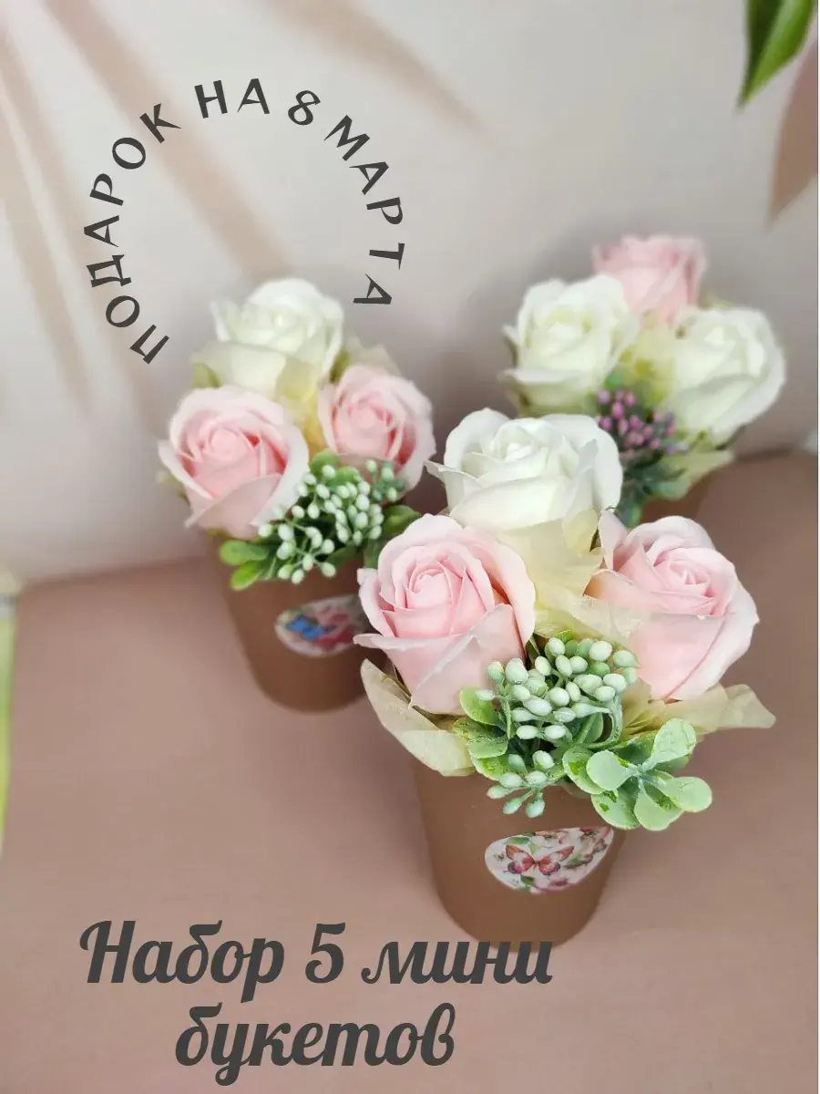 Этот очаровательный набор из пяти букетов из мыльных роз станет прекрасным подарком на 8 марта. Каждый букет состоит из трех нежных мыльных роз, дополненных изысканным декором из зелени и ягод. Розы, созданные из мыльного раствора, полностью растворяются в воде, оставляя приятный аромат. Такой оригинальный и практичный подарок точно порадует ваших близких и создаст праздничную атмосферу.