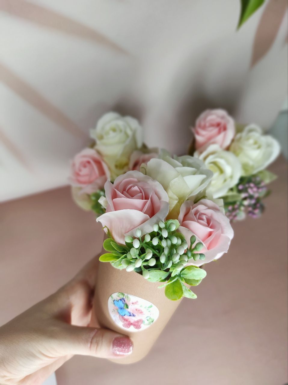 Миниатюрное кашпо, в котором находятся цветы, добавляет букету особый шарм и делает его еще более стильным и оригинальным. Такой подарок обязательно понравится вашим коллегам, и они смогут украсить им свой рабочий стол или дома уютный уголок.