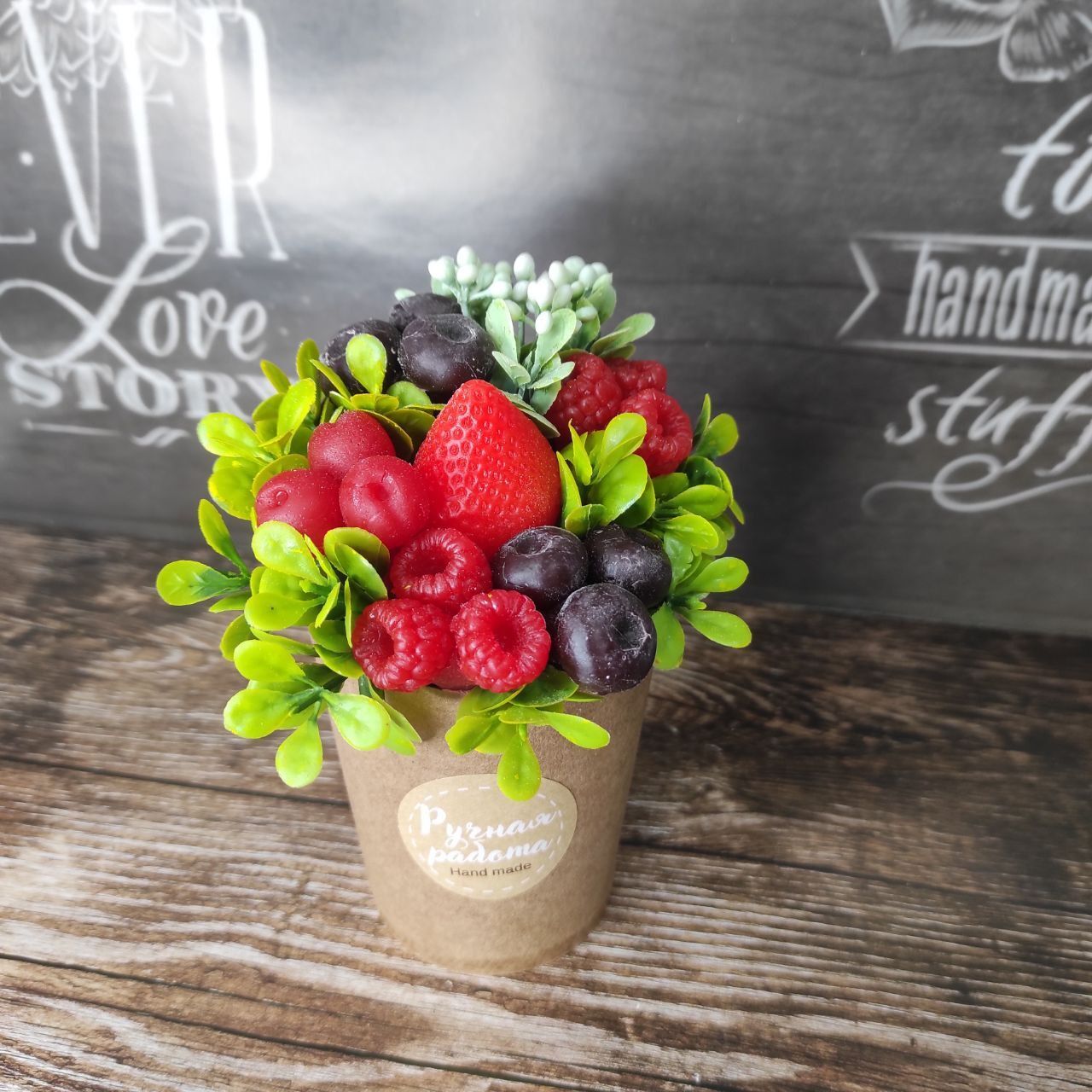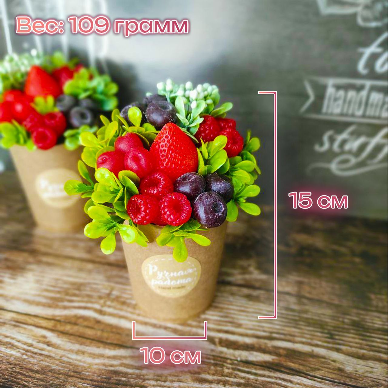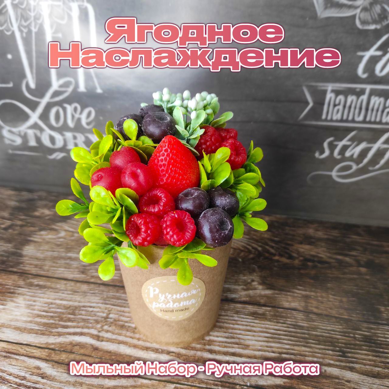 “Мыльно-Ягодное наслаждение” - это уникальный букет, созданный из настоящего мыла! Да это мыло! Этот ароматный букет состоит из безсульфатного мыла, каждый из которых обладает неповторимым ароматом настоящих ягод, таких как клубника, малиновое варенье, черника и спелая вишня.