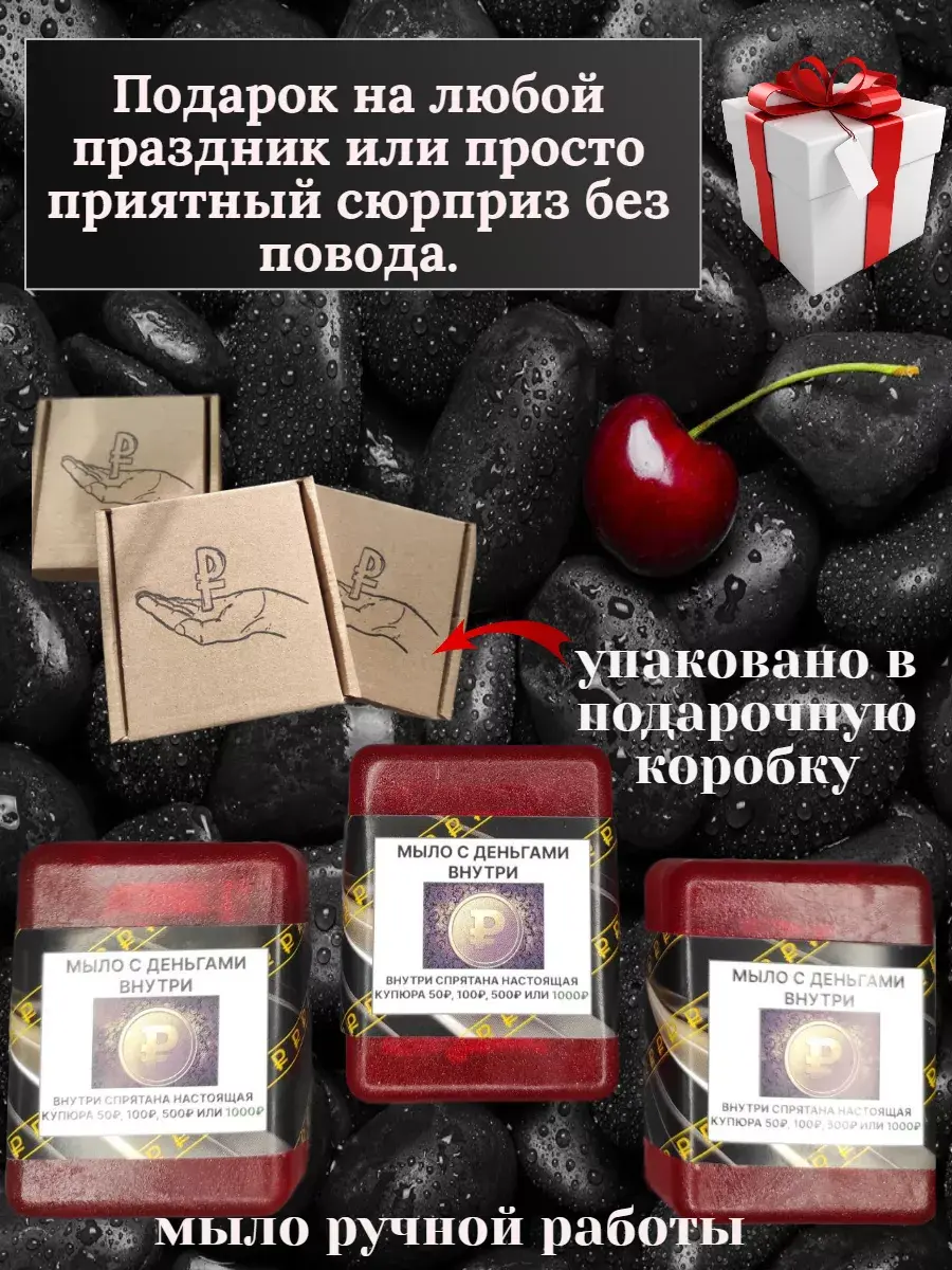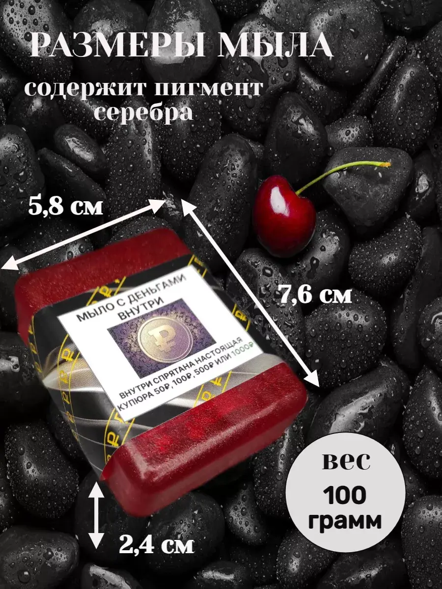 В каждом куске этого удивительного мыла ты найдешь настоящие деньги. Когда ты решаешь использовать это мыло, оно не только увлажняет кожу, но и ласкает тело нежной пеной, которая обладает прекрасным ароматом смородины с виноградом. Такое мыло хорошо пенится и легко смывается, обеспечивая невероятное удовольствие от использования.Каждое из этих прекрасных мыльных изделий содержит пигмент серебра, что делает их еще более привлекательными. Высокое содержание масла какао или масла оливки в составе этого мыла обеспечивает максимальный уход за кожей, делая ее бархатистой и шелковистой. Прекрасный цвет и благородный блеск добавят шарма в вашу ванную комнату.Оригинальный подарок всегда будет оценен по достоинству. Как насчет прикольной штучки для любимого человека? Дополнительным бонусом является то, что в каждом куске этого мыла рандомно залиты купюры номиналом 50, 100, 200, 500, 1000 и 2000 российских рублей. Это подарочное мыло станет отличным выбором для подарка маме, папе или ребенку в день рождения.Этот продукт является результатом ручной работы, что гарантирует его высокое качество. Вся продукция представлена в подарочной коробочке, что делает ее готовой для подарка при получении заказа. Не упусти возможность порадовать своих близких таким оригинальным и запоминающимся подарком!Покупая это уникальное мыло с деньгами внутри настоящими, ты получаешь не только живительное очищение кожи и ароматные наслаждения - ты даришь радость и эксклюзивный опыт использования такого необычного продукта!